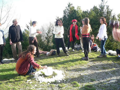 Comenzamos nuestro trabajo en grupo conectándonos con la historia más reciente de Montségur y con la de la resistencia cátara. El castillo que domina Montségur es conocido por haber sido el último bastión de la resistencia de los cátaros contra la cruzada católica que fue lanzada en su contra. Los cátaros que resistieron durante el largo invierno de 1244 terminaron por ser obligados a rendirse a las tropas acampadas abajo y, según la historia, fueron ejecutados en el poste del suplicio, en el prado conocido como “el campo de los quemados”, una pradera que está a los pies del castillo.