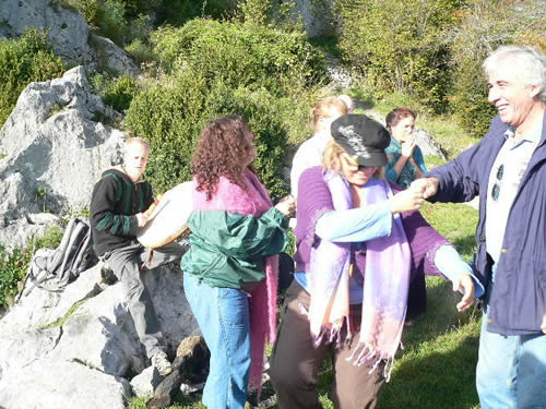 En cualquier caso conseguimos completar nuestra Ceremonia sin más interrupciones y, para cuando regresamos a la base de la montaña, no había gendarmes esperándonos, así que todo salió bien. Pasamos un rato descansando tranquilos en el “Campo de los Quemados” y yo tuve una poderosa sensación de que muchos de nosotros ya habíamos estado allí antes, y ahora estábamos dejando que las viejas energías fuesen “transmutadas” en y a través de nosotros, renaciendo de una manera nueva y más alegre. Aquí tienen una imagen de ese prado: